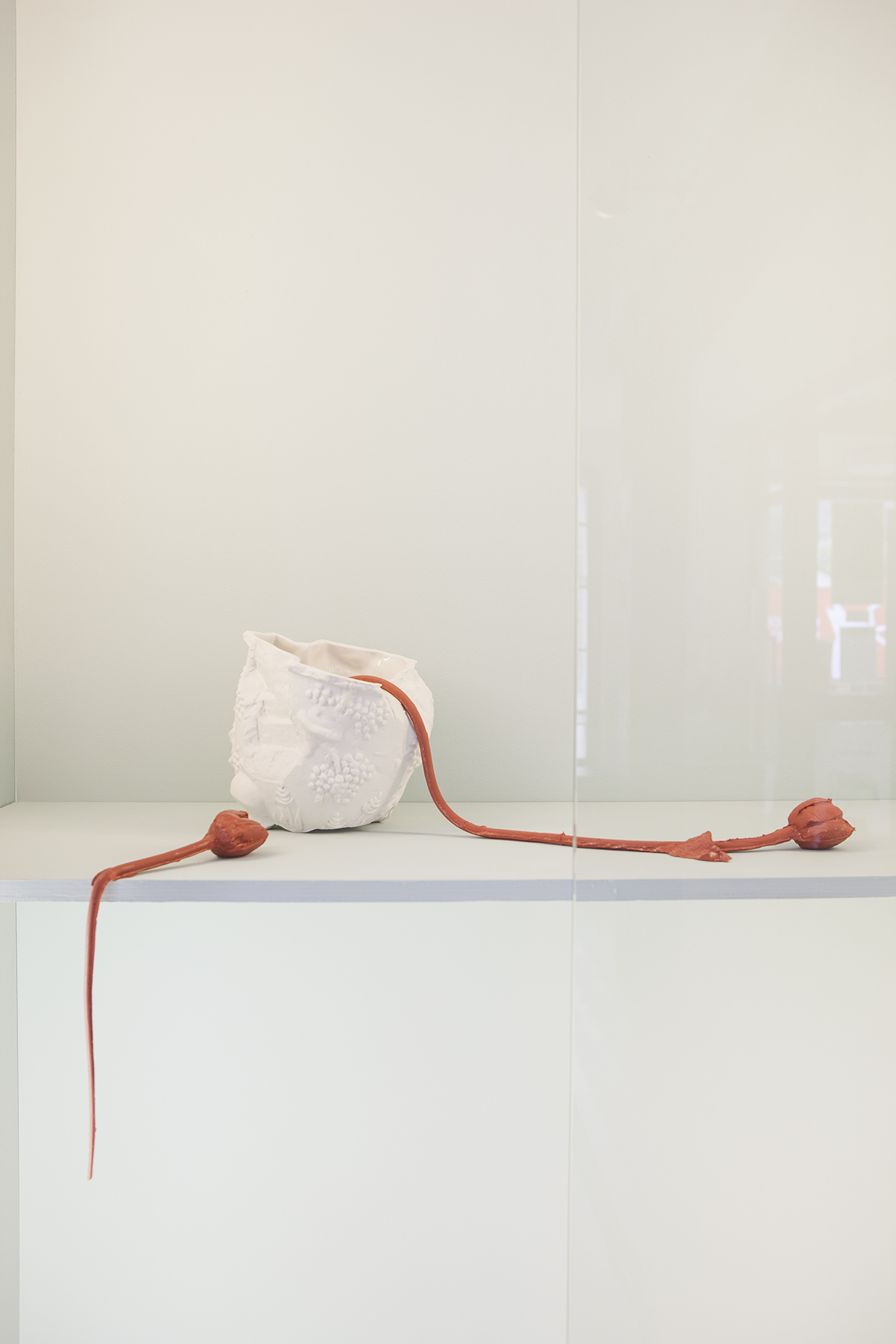 Kristin Weissenberger nimmt die alte Gießform eines Blumentopfes mit floralem Relief der Tonindustrie Scheibbs zum Ausgangsobjekt für eine Installation aus Porzellan-Objekten, Silikon und skulpturalen Elemen- ten aus eigens entwickeltem Material. Der Blick auf die Natur, Vorstellungswelten von schöner, hässlicher, veränderter oder dienstbar gemachter Umwelt, stehen im Fokus der Arbeit.