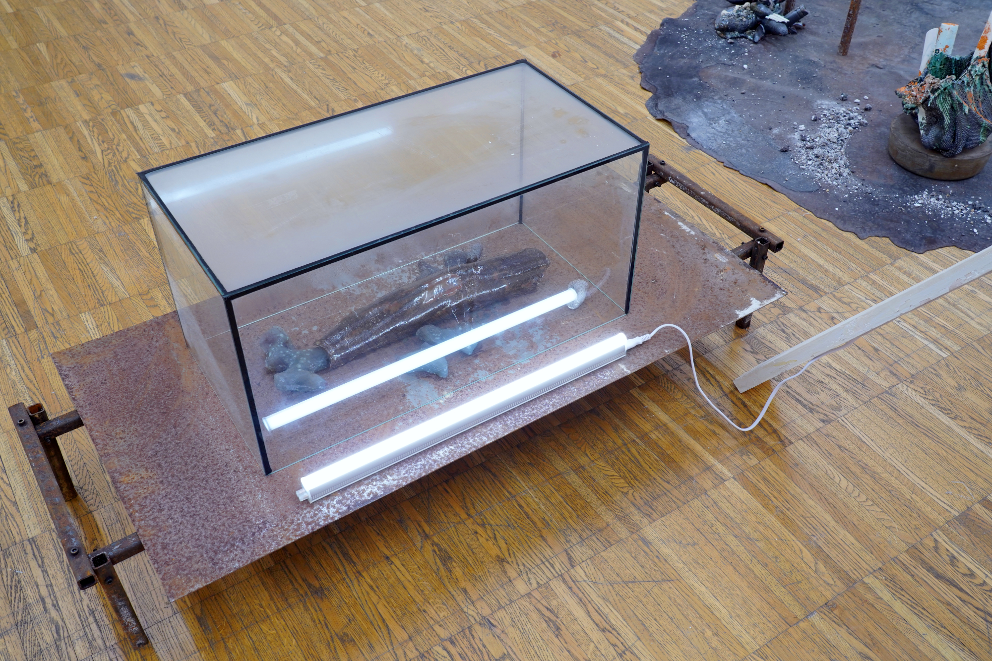 Allerdings sind es die zukünftigen Erdschichten, die hier befragt werden müssen. Es handelt sich um eine Archäologie der Zukunft (Frederic Jameson, Ursula K. Le Guin). Die Geologie übt sich heute in Science Fiction. „[T]he Anthropocene itself can usefully be understood as a science fiction trope“, schreibt die Kulturwissenschafterin Ursula Heise. Warum ist das Anthropozän eine prototypisches Science Fiction? Es taugt vielleicht gar nicht so sehr als Definition einer geologischen Epoche, aber, so Heise, es ist ein sehr wirksames Gedankenexperiment: Es entwirft die Gegenwart als eine Zukunft, die bereits stattgefunden hat; „to cast the present as a future that has already arrived – one of the quintessential functions of contemporary science fiction“.2 Die Frage stellt sich im Futur II: Was werden wir zurückgelassen haben? Wie sehen die Erdschichten aus, die wir dabei sind zu kreieren? Welche Spuren, welche Abdrücke, welche Reste wird man von uns finden? Allerdings ist das Anthropozän keine neutrale Epochen-Bezeichnung, sondern eine Diagnose und Warnung. Wie könnte sich eine Anthropozän-Schicht in dem Fossilbericht der Erde bemerkbar machen? Die Vorschläge sind einigermaßen unappetitlich: Mikroplastik, radioaktiver Niederschlag, massenhafte Ansammlungen von Hühnerknochen. etwas ansprechender formuliert -nämlich von donna Haraway in Unruhig bleiben: „die Großen Beschleunigungen der Nachkriegsära meißeln ihre Spuren in die Steine, Gewässer und Kritter der Erde.“ in jedem Fall: das Zeitalter, das nach anthropos, dem Menschen, benannt werden soll, ist eine Katastrophenmeldung. Die Paläontologie nahm ihren Anfang, als die versteinerten Knochen von riesigen Echsen ausgegraben wurden und man nicht mehr umher kam sich einzugestehen, dass die Erde einst von ganz anderer Flora, Fauna und Funga bewohnt war. Die Evolution wurde entdeckt und mit ihr das Aussterben. Auch heute wird ausgestorben, allerdings – apropos Tempo – noch viel schneller als in der Geschichte des Planeten üblich. Der Mensch erscheint im Holozän, aber wer verschwindet im Anthropozän? Wo sind eigentlich die Menschen in der Ausstellung Digging out from rusted ground? Schon verschwunden oder nur gerade nicht da? Sind es Spuren und Überreste auf einem inzwischen toten Flecken Erde, die wir sehen. Oder ist hier, wenn wir genauer hinsehen, nicht doch etwas höchst Lebendiges zu finden? Sind die Lebewesen, die gelernt haben, mit und in unseren giftigen Hinterlassenschaften zu leben so anders, dass wir sie auf den ersten Blick gar nicht erkennen können? Für mich ist Digging out from rusted ground eine Einladung archäologisch, paläontologisch, geologisch zu werden, in dem Sinne, dass Oberfläche und Tiefe, Natur und Kultur, tiefe Vergangenheit und weit entfernte Zukunft ineinander geschoben, zusammen gepresst und flüssig gemacht werden. Es gibt aber sicherlich ganz viele Eingänge und Blicke auf die Kunstwerke von Kristin Weissenberger und Andreas Perkmann – und darum lass ich Sie diese jetzt am besten selbst erkunden.
